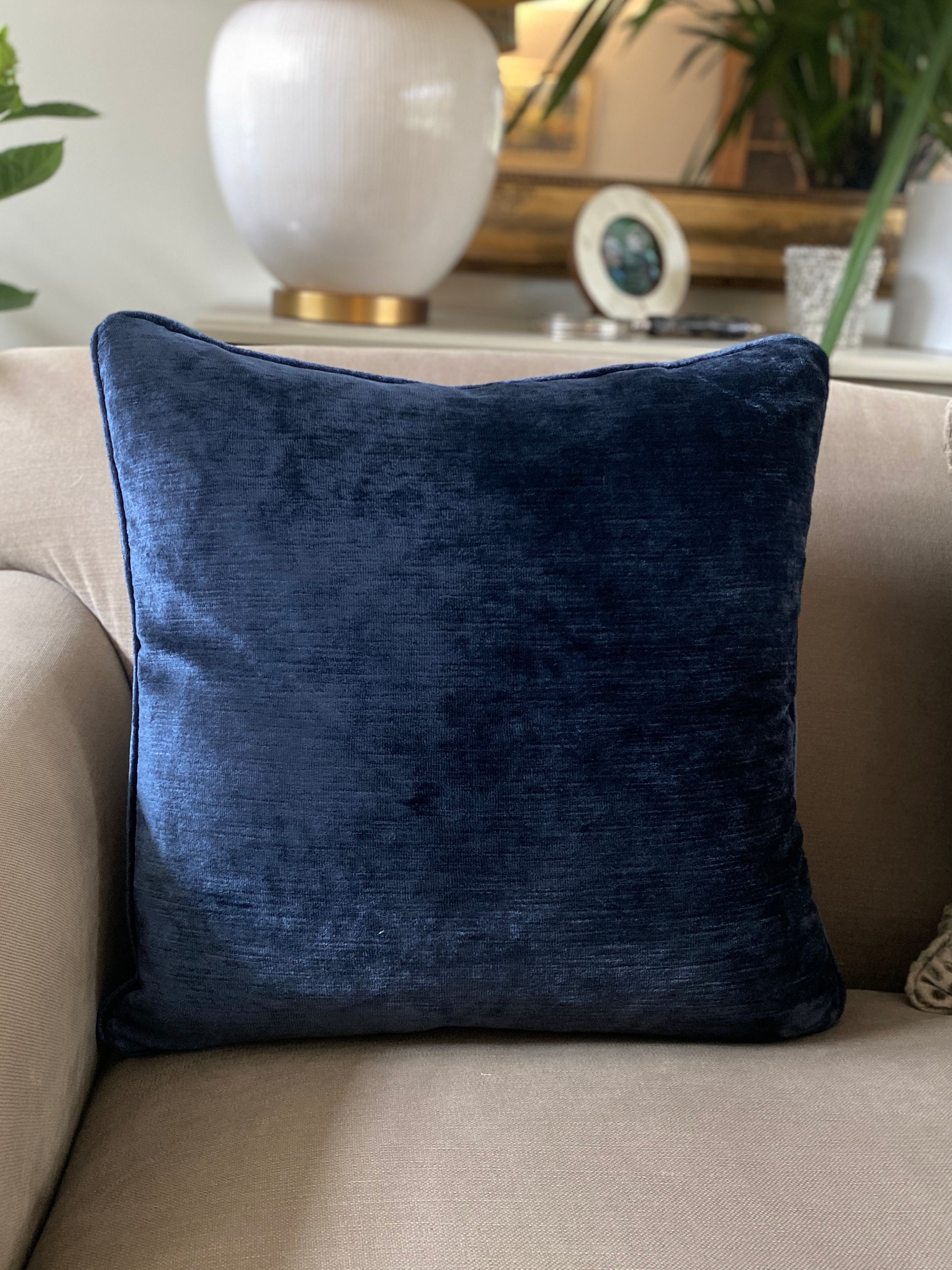 This navy velvet cushion is a glorious shade of rich navy blue with a slightly textured stripe within the velvet pile and is wonderfully tactile. Crafted by artisans who have mastered their skills over decades it complete with a concealed zip and smart self piping around the edge. It also comes with an inner feather pad for a wonderful plumpness and supreme comfort.