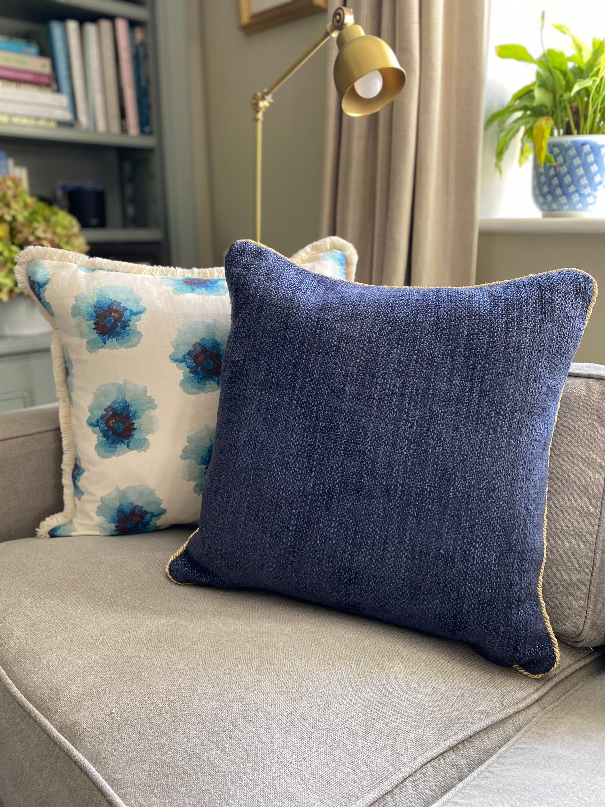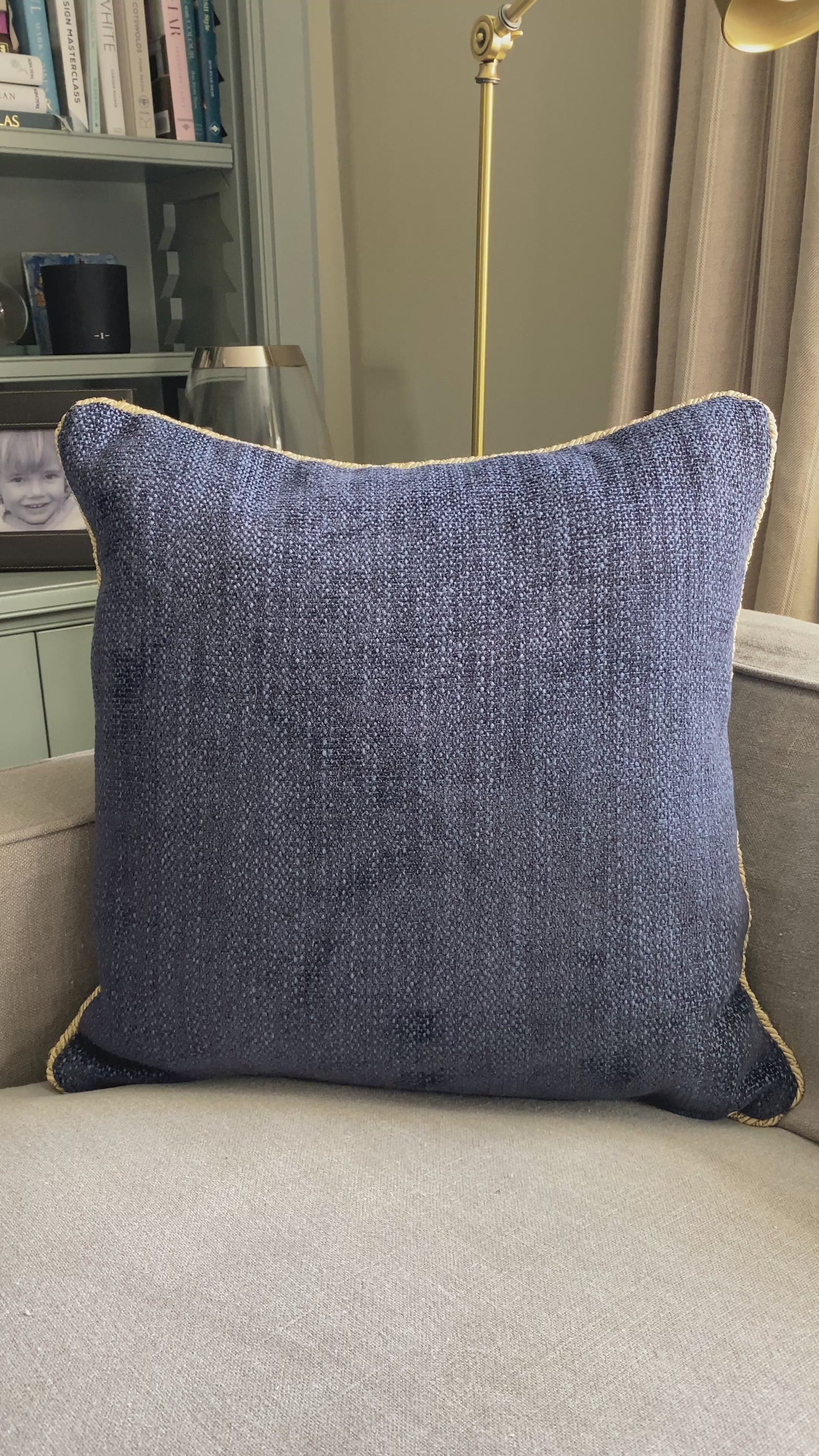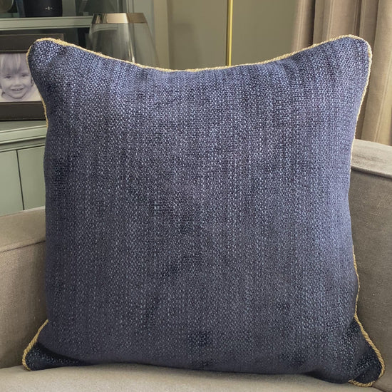 Navy chenille cushion with gold cord trim